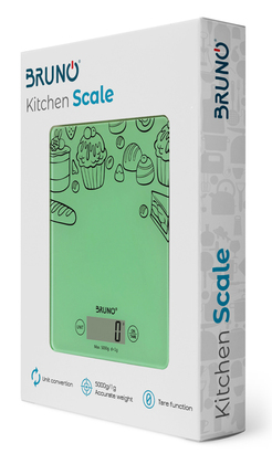 Ψηφιακή ζυγαριά κουζίνας της Bruno με επιφάνεια κατασκευασμένη από tempered glass και μεγάλη ευανάγνωστη οθόνη LCD. Διαθέτει 4 μονάδες μέτρησης (g, lb, oz, ml) και δυνατότητα μέτρησης έως 5kg με ακρίβεια 1g.